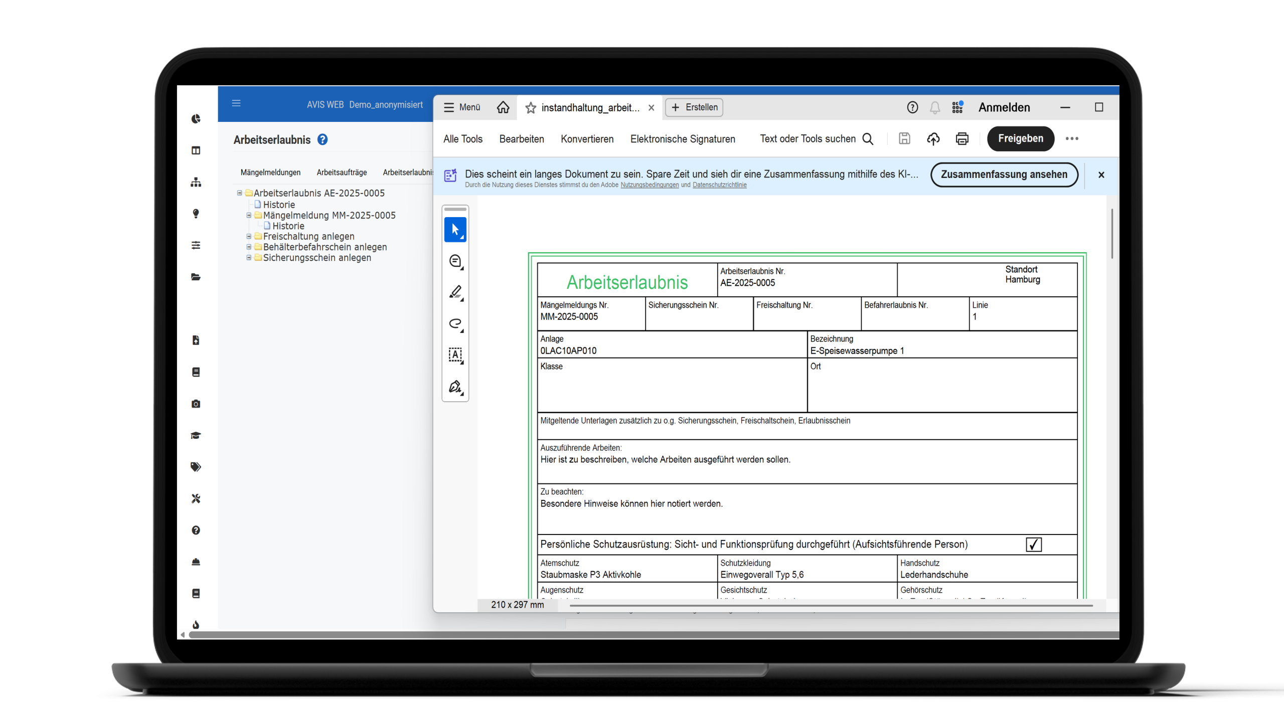 Das digitale Formularwesen in AVIS® ersetzt vormals papierbasierte Arbeitsscheine und Formulare durch eine moderne, webbasierte Lösung. Es dient als zentrales Element zur Standardisierung und Absicherung kritischer Betriebsabläufe, insbesondere in der Instandhaltung von Kritischen Infrastrukturen. Beliebige Formulare, wie Arbeitserlaubnis, Freischaltungsschein oder Behälterbefahrschein, können konfiguriert und in zusammenhängenden Workflows abgebildet werden.