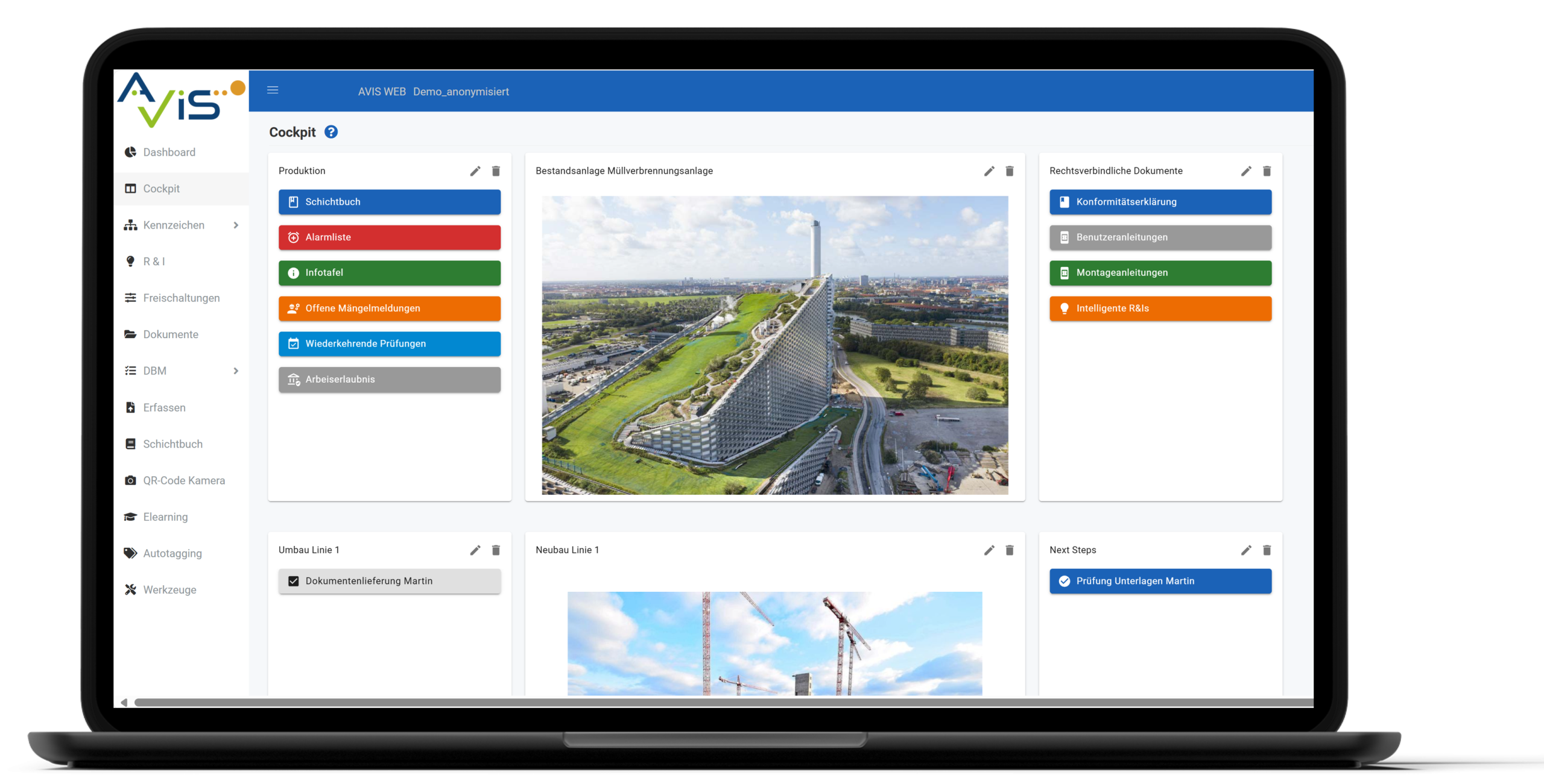 Direkte Kacheln oder Links zu häufig benötigten Übersichten (z.B. offene Mängelmeldungen oder überfällige Prüfberichte).