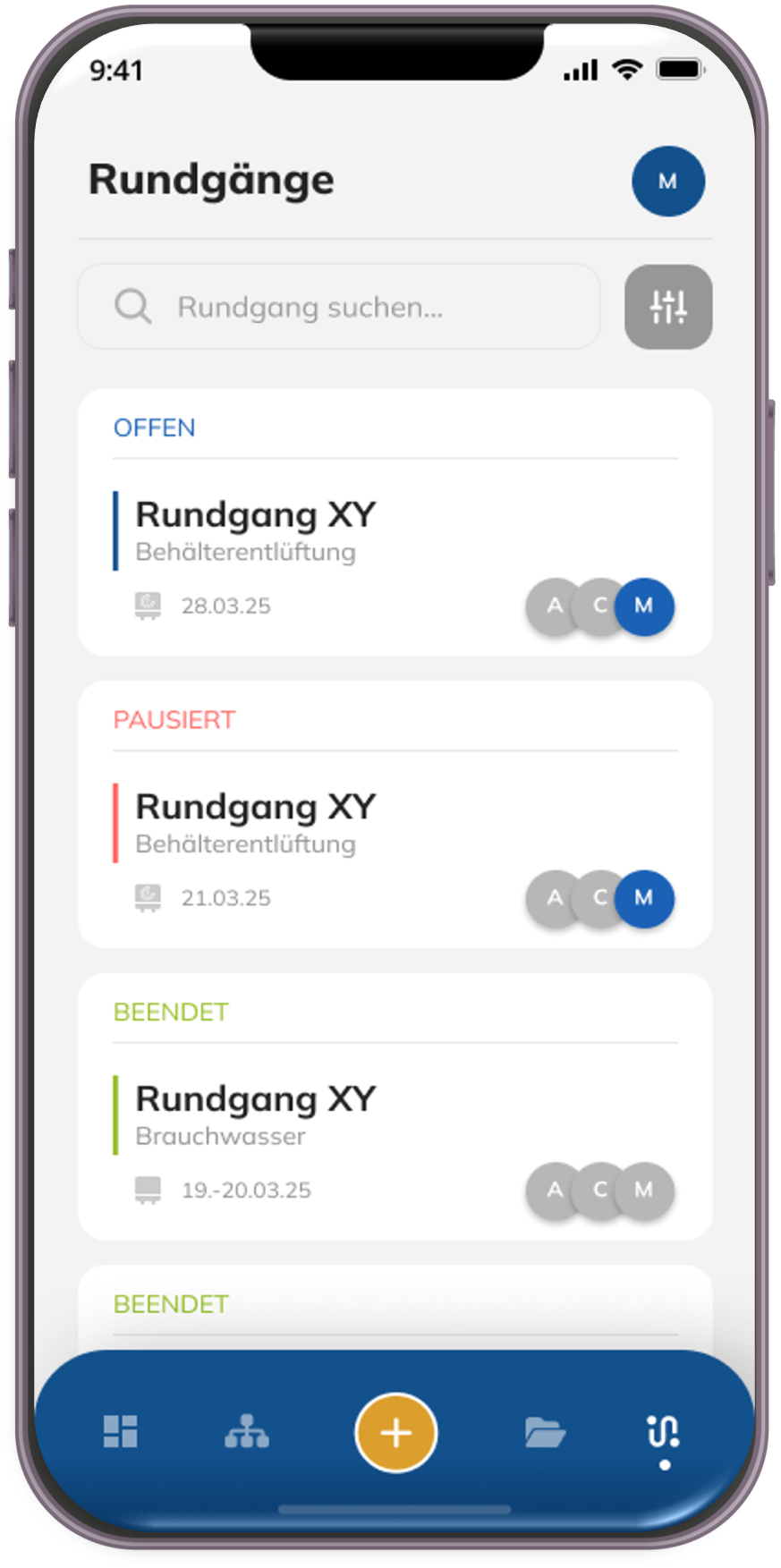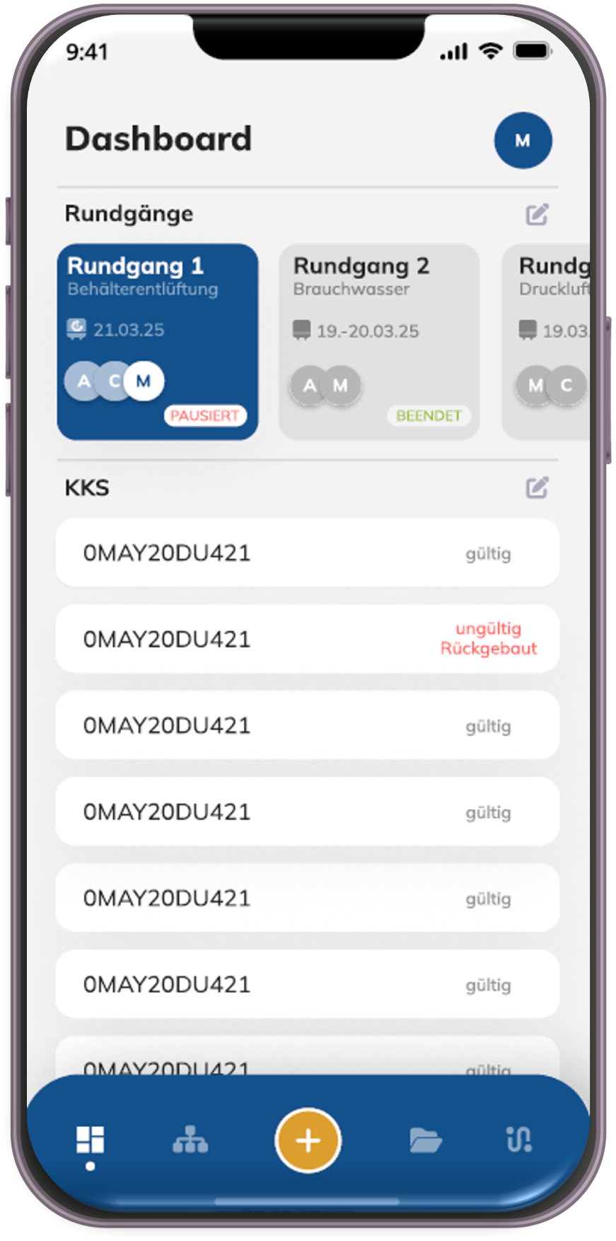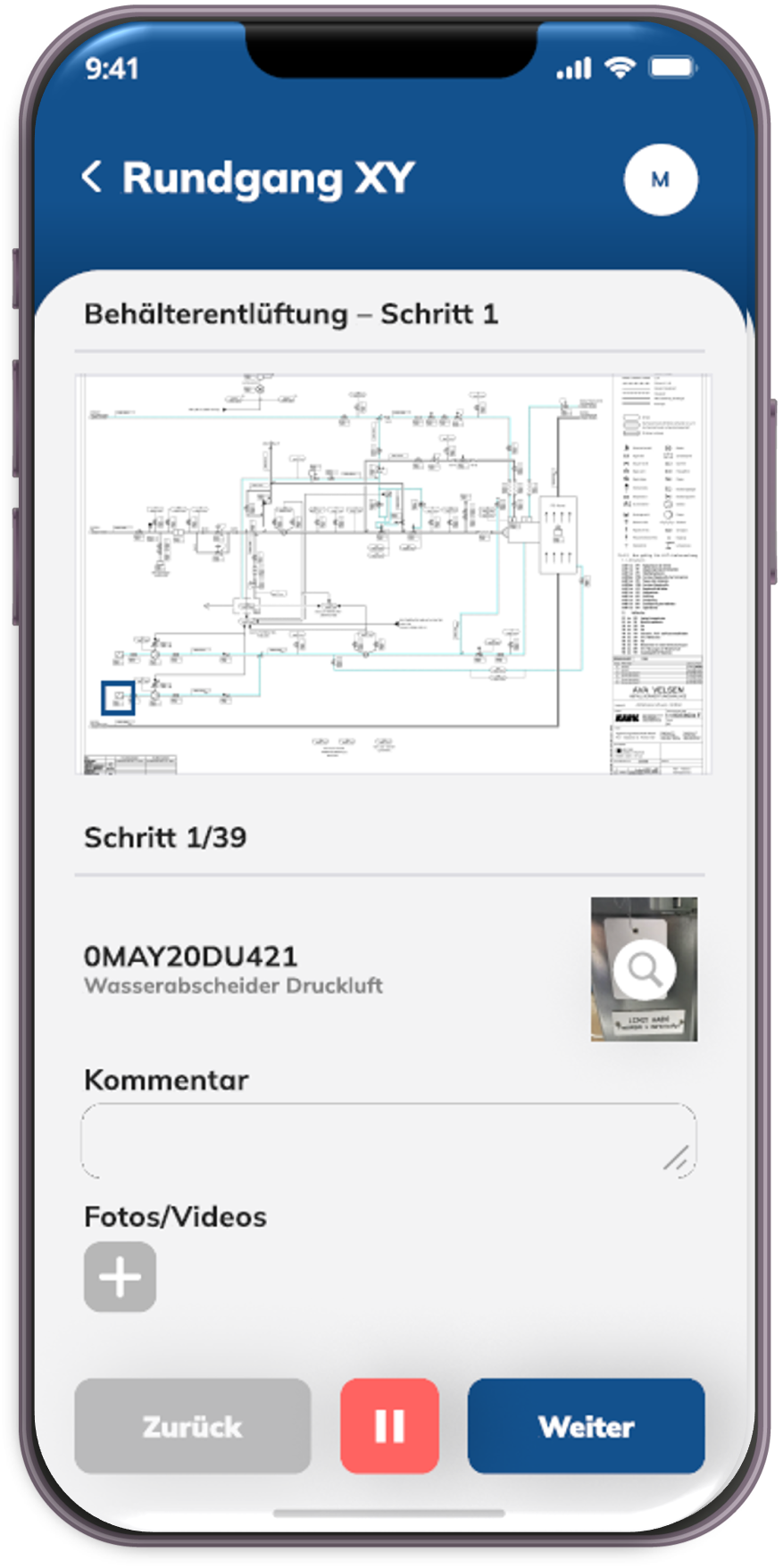 Die App dient zur systematischen Erfassung von Inspektionsdaten während Rundgängen. Dabei macht die Anwendung die Dokumentation sehr einfach: Kommentare, Fotos und gegebenenfalls die Anlagenbarcodeerfassung ergänzen die Dokumentation der Inspektionsergebnisse.