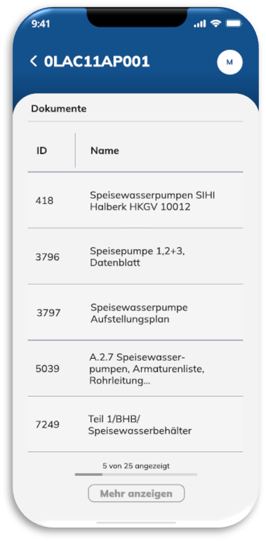 Mitarbeiter können über die ihnen vertraute KKS-/AKZ-Struktur gezielt auf die vollständige, aktuelle Technische Dokumentation zugreifen – Pläne, Handbücher, Datenblätter und Ersatzteillisten sind direkt am Aggregat abrufbar.