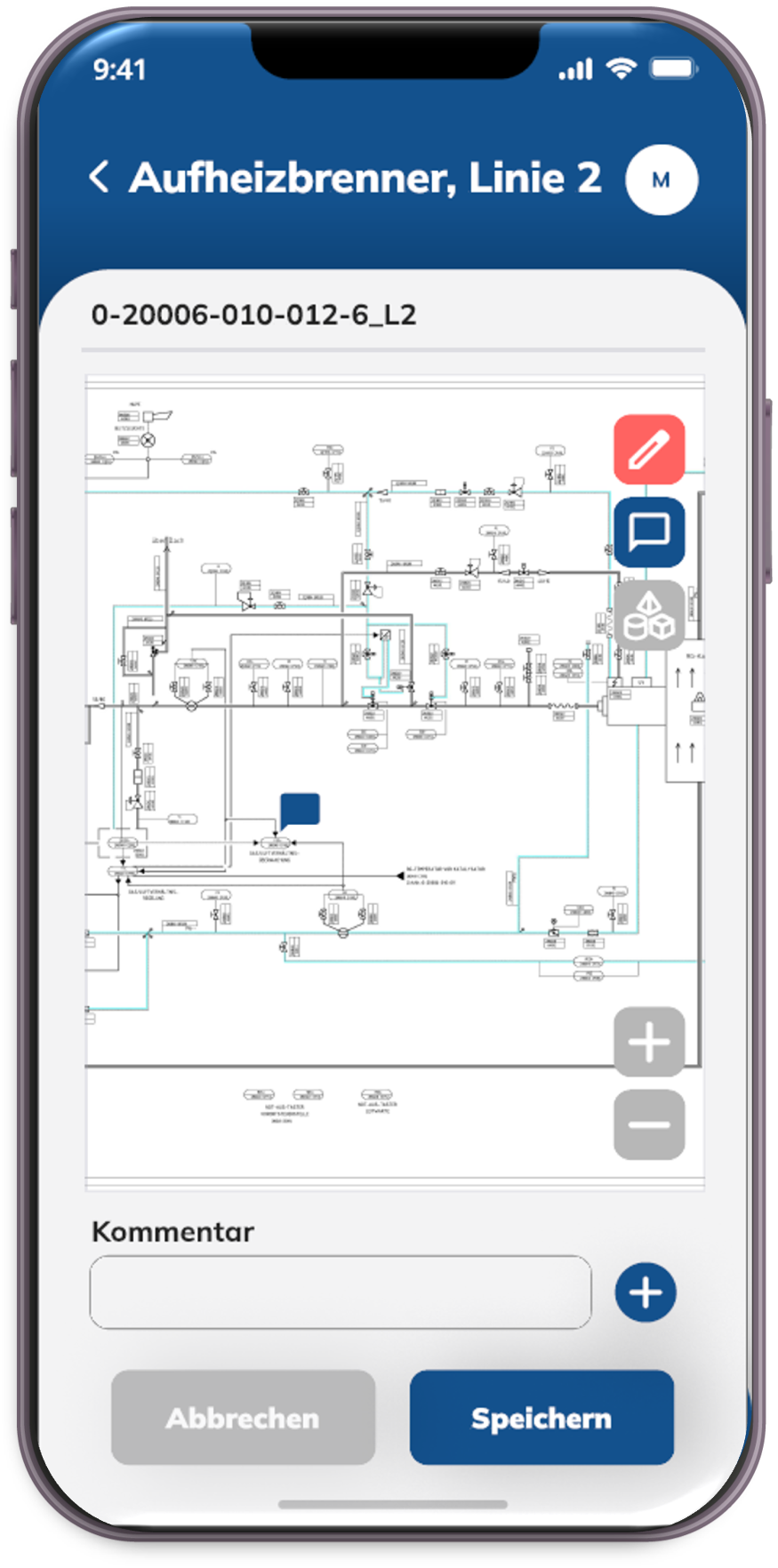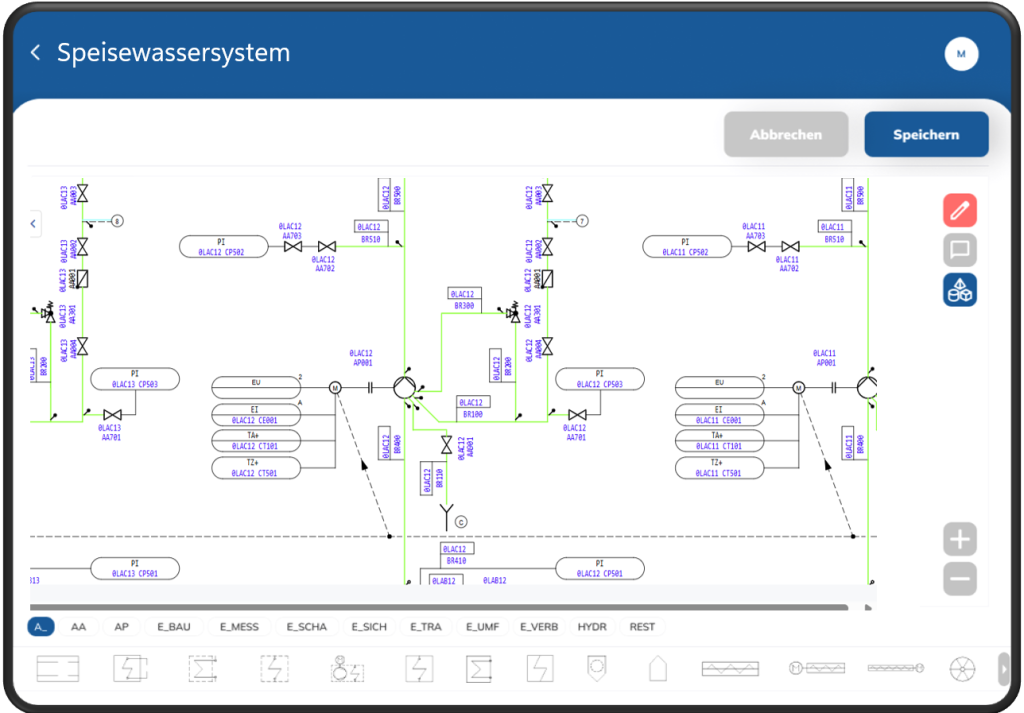 Die mobile Vornahme von Roteinträgen ermöglicht es Instandhaltern, Technikern oder Fremdfirmen, Änderungen und Abweichungen vom Plan – beispielsweise nach einer Reparatur oder einem Umbau – direkt digital im R&I zu markieren.