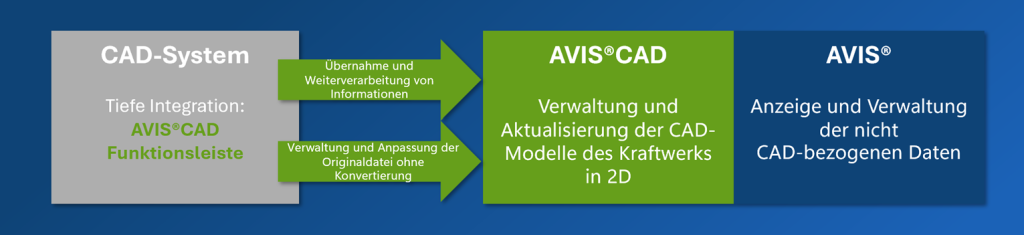 Während AVIS® für die Anzeige und Verwaltung aller Daten zuständig ist, übernimmt AVIS®CAD die spezifische Aufgabe, die CAD-Daten effizient zu verwalten und zu aktualisieren. Dies stellt sicher, dass alle relevanten Informationen sowohl in visueller als auch in dokumentarischer Form jederzeit verfügbar sind und den aktuellen Betriebszustand der Anlage widerspiegeln.