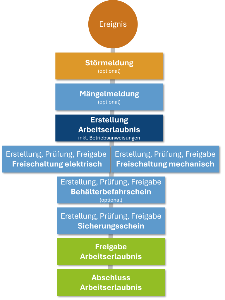 Das zentrale Element ist der durchgängige Workflow, der alle für die Revisionsplanung in Anlagen der Kritischer Infrastruktur erforderlichen Arbeits- und Freigabescheine abbildet:
